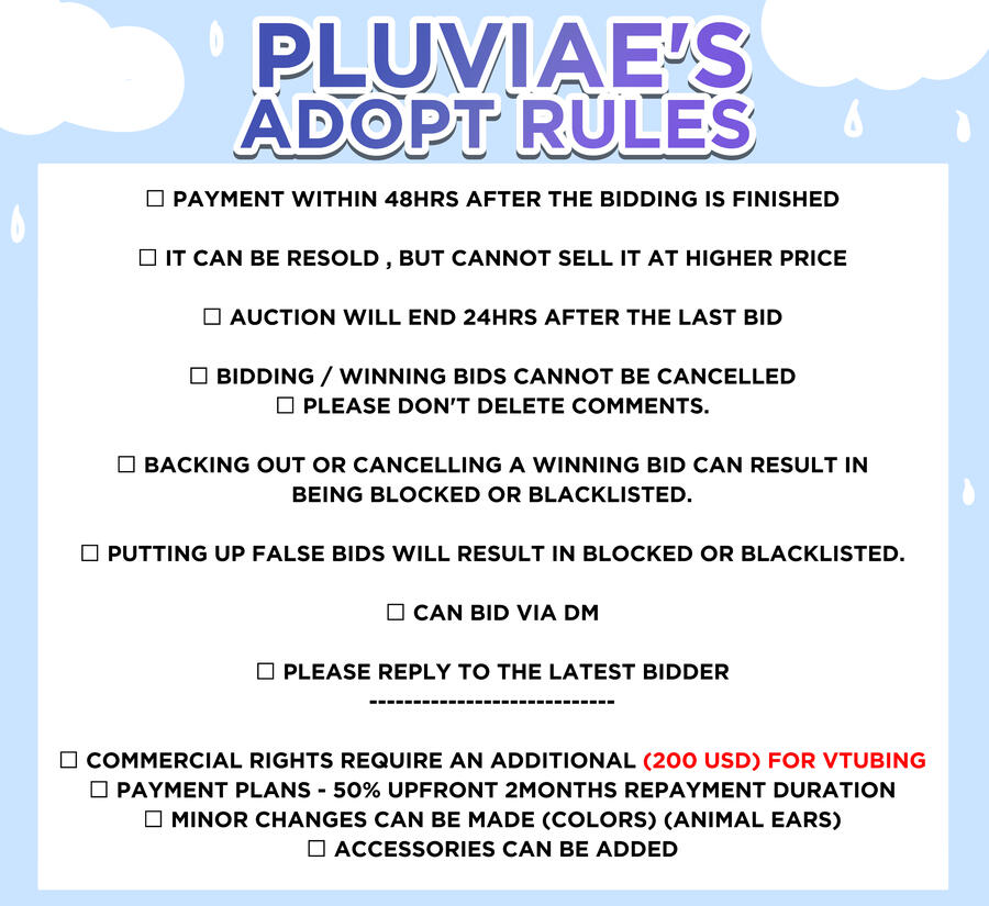THE COMMISSIONER MAY REPOST , SHARE AND USE THE COMMISSIONED PIECE.▪ YOU ARE NOT ALLOWED TO RE EDIT MY WORKS.▪ YOU ARE NOT ALLOWED TO RESELL OR MAKE A PROFIT ON MY WORKS.▪ YOU ARE NOT ALLOWED TO GET MODEL COSTUMES FOR YOUR MODEL ON OTHER ARTIST.▪ YOU ARE NOT ALLOWED TO TRAIN MY WORKS INTO AI MY WORKS IS A PRODUCT OF HARDWORK.▪ CREDITS MUST BE GIVEN.----- RIG CHANGES (VTUBE STUDIO)▪ PLEASE CONSULT ME FIRST BEFORE MAKING CHANGES ON VTUBE STUDIO SETTINGS .